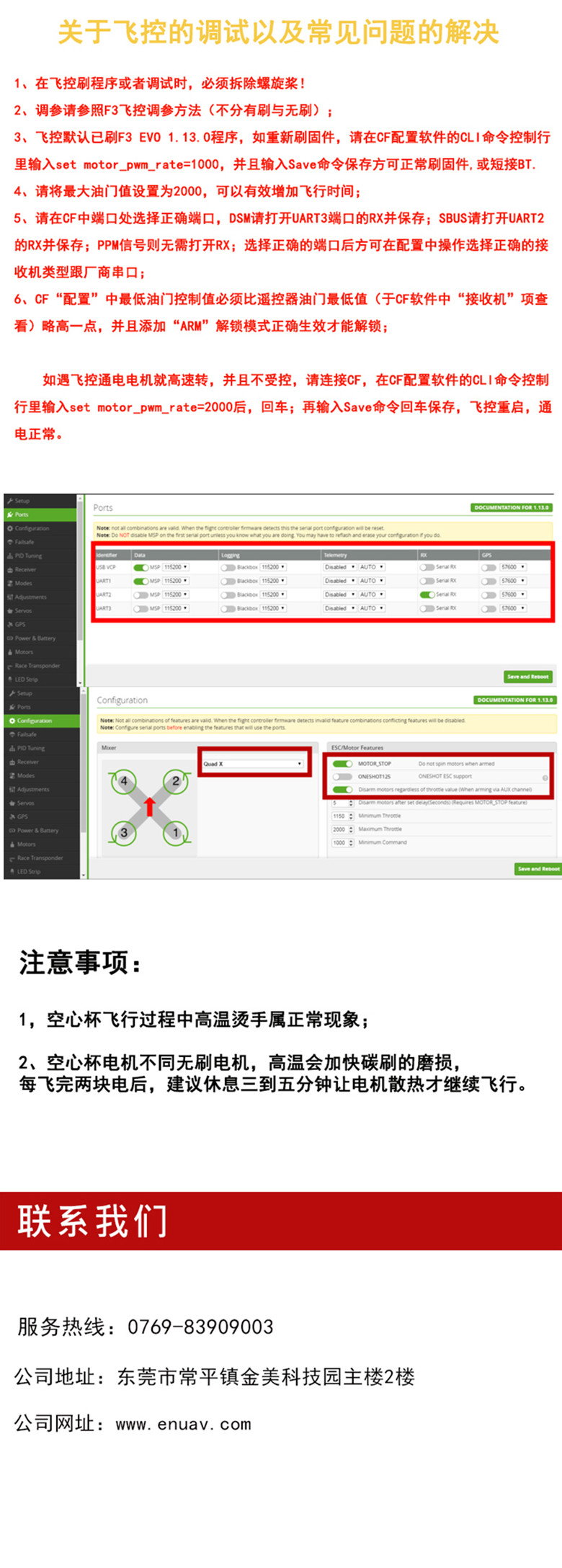 3.飞控默认已刷F3 EV0 1.13.0程序,如重新刷固件,请在CF配置软件的CLI命令控制行里输入set motor_pwn_rate=1000,并且输入Save命令保存方可正常刷固件,或短接BT.