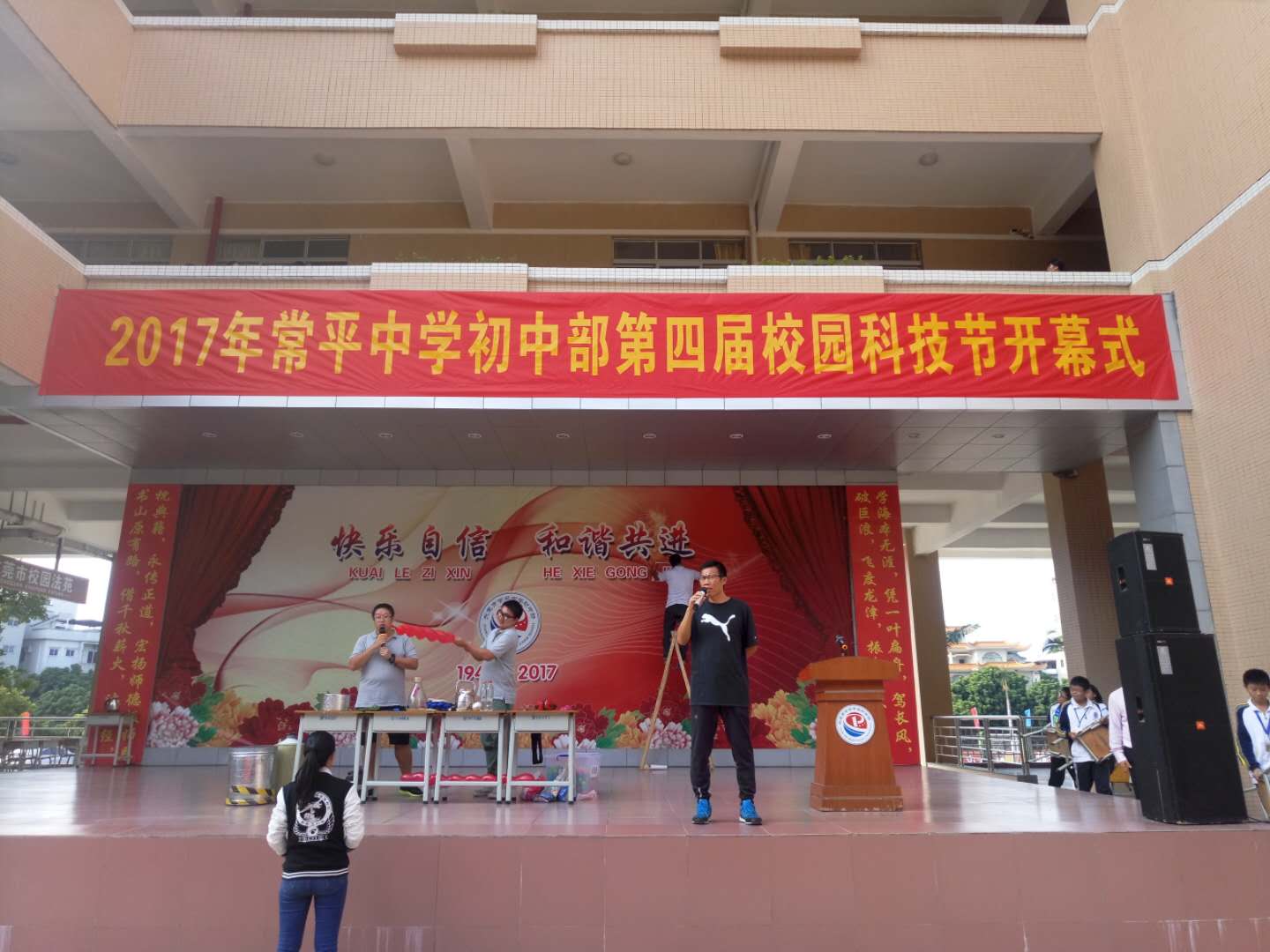 11月8日下午,常平中学初中部第四届科技节在科技秀和精彩的无人机表演、航模表演下隆重开幕。本次科技节以"实践·创新·合作·成长"为主题,开展结合创新思维和实践能力的各种丰富多彩的活动。