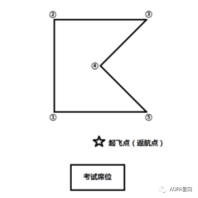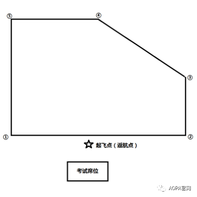 (一)起飞点(返航点)与考试席位的相对方位由委任代表根据现场环境等情况进行决定。按图于起飞点前规划一个五边形并循环执行,①②边及②③边的边长为 a,∠②为 90°,航线相对地面高度为 b,水平速度为 c,垂直速度为 d,转弯模式为停止转弯,各点停留时间为 e;