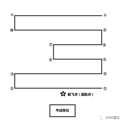 (一)起飞点(返航点)与考试席位的相对方位由委任代表根据现场环境等情况进行决定。按图于起飞点前规划扫描航线,航线长度为a,航线间隔为 b,航线相对地面高度为 c,水平速度为 d,垂直速度为e,转弯模式为停止转弯,停留时间不作要求;