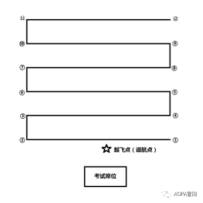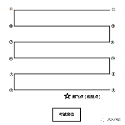 (一)起飞点(返航点)与考试席位的相对方位由委任代表根据现场环境等情况进行决定。按图于起飞点前规划扫描航线,①②、③④、⑨⑩、⑪⑫航线长度为 a1,⑤⑥、⑦⑧航线长度为 a2,航线间隔为b,航线相对地面高度为 c;