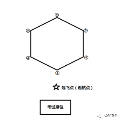 (一)起飞点(返航点)与考试席位的相对方位由委任代表根据现场环境等情况进行决定。于起飞点前规划一个六边形并循环执行,边长为 a,①②③航点相对地面高度为 b,④⑤⑥航点相对地面高度为 c,水平速度为 d,垂直速度为 e,转弯方式为停止转弯,各点停留时间为 f;