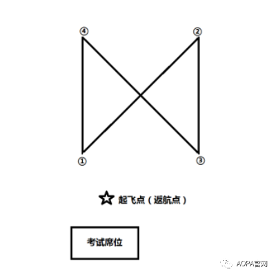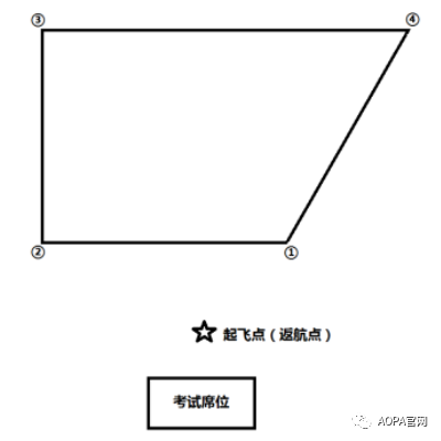 (一)起飞点(返航点)与考试席位的相对方位由委任代表根据现场环境等情况进行决定。按图于起飞点前规划一个闭合图形并循环执行,各点之间距离不小于 20 米,①点相对地面高度为 a,②点相对地面高度为 b,③点相对地面高度为 c,④点相对地面高度为 d,水平速度为 e,垂直速度为 f,转弯模式为停止转弯,停留时间不作要求;