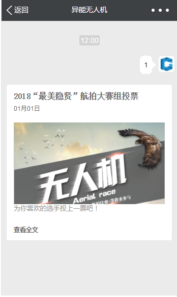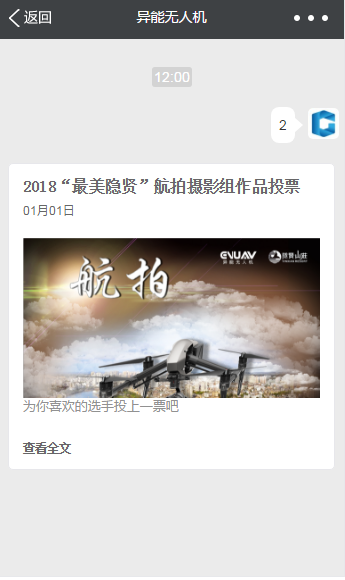 关注“异能无人机”公众号,在订阅号对话框输入“1”并发送,即可进入航拍组投票页面进行投票;在订阅号对话框输入“2”并发送,即可进入视频组投票页面进行投票!